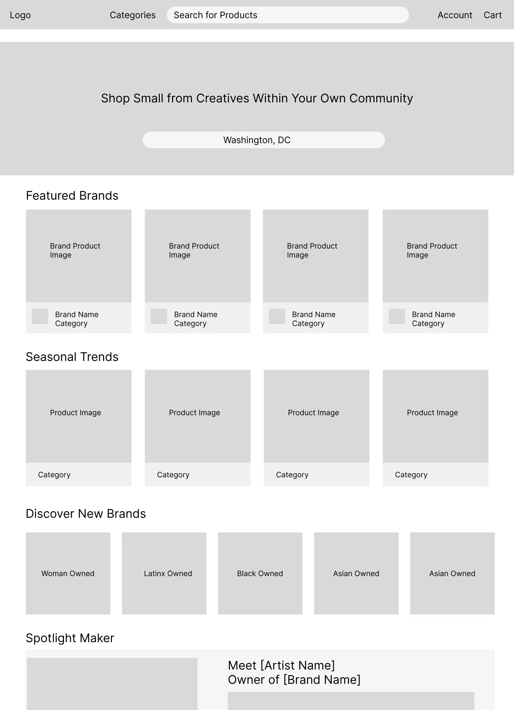 I designed the majority of the screens in low fidelity before jumping into developing a visual style. While laying out this foundation, I noticed how blocky and grid like most of the screens appeared (due to the nature of a product driven site). The format is great for a clear, structured layout - however, I felt like it lacked the energy and artistry I wanted to convey. This takeaway heavily influenced the visual design decisions I made in the next step, since I knew it was necessary to go more creative and bold to add life to the site!